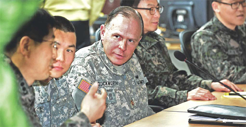 | 한·미 연합훈련인 ‘키 리졸브’ 연습이 진행된 15일 경기도 수원 소재 ‘대항군전쟁수행모의본부’에서 한·미 연합군이 작전을 논의하고 있다. 이날 언론에 처음 공개된 모의본부는 훈련 기간 가상의 북한군 총사령부 역할을 수행한다. 사진공동취재단 |