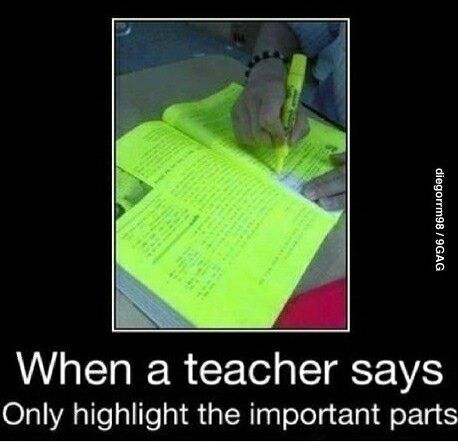 형광펜이 보통 중요한 부분을 표시하기 위해 사용하지만 이 학생은 아마도 전체가 다 중요하다고 생각한 것처럼 보인다. 특히 사진 아래에는 ‘선생님께서 중요한 부분만 형광펜을 칠하라고 말씀하셨을 때’라는 문구가 붙어있어 웃음을 자아낸다.