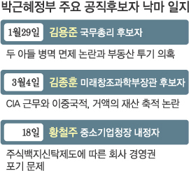 ‘준비된 대통령’을 외쳤던 박 대통령은 유독 인사 부문에서 잡음을 계속 내고 있다. 박 대통령이 전문성 위주로 인선을 하다 보니 기본적인 검증조차 이뤄지지 않고 있다는 지적이다. 각종 의혹으로 비판여론이 들끓자 자진사퇴한 김용준 전 국무총리 후보자와 김종훈 전 미래창조과학부장관 후보자가 대표 사례로 꼽힌다. 김용준 전 후보자는 두 아들의 병역면제와 부동산 투기 의혹을 받았고, 김종훈 전 후보자는 국적과 거액의 재산 축적 논란에 휩싸였다.