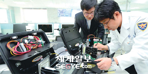사상 초유의 방송·금융 전산망 마비 사태와 관련해 21일 경찰청 사이버테러대응센터 해킹·악성코드 분석실에서 연구원들이 피해를 당한 PC의 하드디스크와 서버를 분석하고 있다.