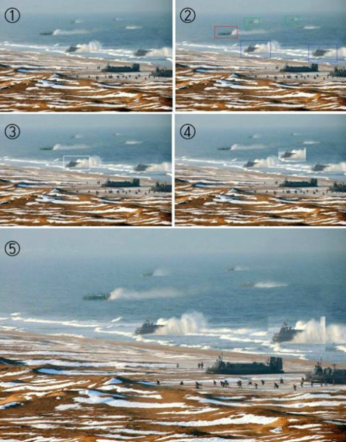 미국 시사월간 애틀랜틱은 26일(미국시간) 홈페이지를 통해 북한 조선중앙통신이 보도한 훈련 사진에서 공기부양정이 많게 보이려고 3군데에서 조작한 흔적이 엿보인다고 보도했다.