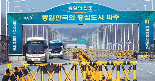 | 북한이 개성공단 폐쇄 가능성을 언급한 다음날인 31일 경기 파주시 통일대교에서 개성공단 출입 차량들이 정상적으로 오가고 있다. 파주=연합뉴스 |
