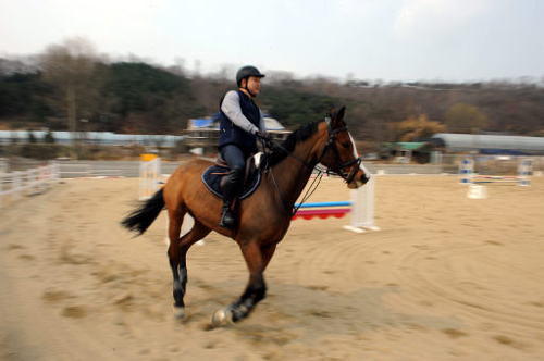 | 부천승마공원에서는 게임중독이나 정서불안 증상을 보이는 저소득층 청소년들에게 부천시가 제공하는 재활승마 프로그램이 진행된다. 부천승마공원에서 한 회원이 승마를 즐기고 있다. |