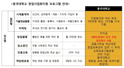 전 주기 창업지원 시스템(D-CAPS™:Dongguk Collarborative Acceleration Programs for Startups)을 도입하고 ‘One-Stop Startup’을 위한 ECUVEST™시스템(Education-Incubating-Investment)을 일괄 지원하는 동국대학교에 참여를 희망하는 기술창업자는 오는 17일 15시까지 ‘창업지원 온라인 관리시스템(startbiz.changupnet.go.kr/jiwon)’으로 신청하면 된다.