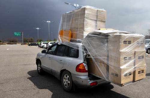 | 북한이 개성공단 가동을 중단시킨 9일 지붕 위까지 짐을 싣고 공단에서 귀환한 차량이 경기도 파주시 경의선 남북출입사무소 앞에 주차돼 있다. 차량 너머로 보이는 먹구름이 폐쇄 위기에 놓인 개성공단의 현실을 보여주는 듯하다. 파주=연합뉴스 |