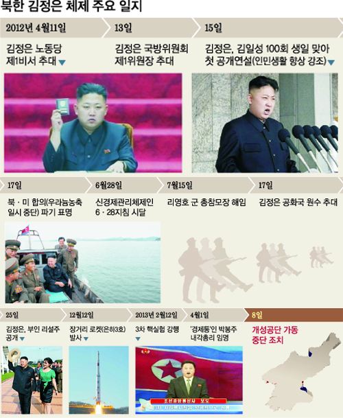 김정은 체제는 지난 1년 동안 ‘변화’와 ‘도발’ 사이를 오갔다. 지난해 초 북한 매체는 나이 어린 지도자의 한계를 지적하는 외부의 시선을 의식한 듯 ‘김일성 조선을 더욱 빛내이실 젊으신 위대한 영도자’(노동신문 2012년 1월28일), ‘인민에게 희망 안기는 젊은 영도자’(조선신보 2월16일)라는 표현을 동원해 가며 김정은의 ‘젊음’에 ‘희망적 이미지’를 중첩시켰다.