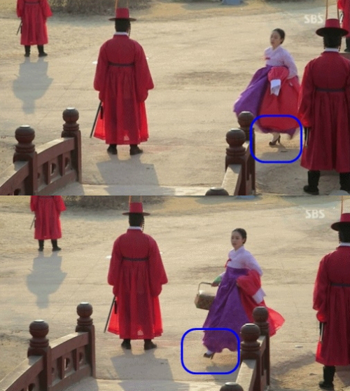 세자 이순(유아인 분)의 도움으로 궁중에서 빨래 등 옷감을 관리하는 세답방에서 다홍치마를 지은 장옥정은 인경에게 새 옷을 무사히 전달했다. 하지만 김태희가 옷을 들고 달리는 장면에서 현대의 하이힐만큼 굽이 높은 꽃신이 드러나 시청자들을 깜짝 놀라게 만들었다.
