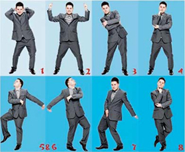 | 영국 일간 ‘선’은 ‘강남스타일 파트2 -싸이의 새로운 춤 따라하기’라는 기사에서 ‘젠틀맨’의 안무를 8개 동작으로 나누어 상세히 설명했다. 리 프라이스 기자가 직접 시연자로 나섰다. |