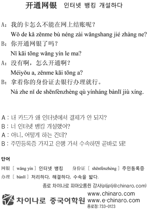 [生生 중국어 한마디] 인터넷 뱅킹 개설하다 입력 : 2013-04-26 17:58:57 수정 : 2013-04-26 17:58:57 구글 네이버 유튜브 Copyright ⓒ 세계일보. 무단 전재 및 재배포 금지 세계일보