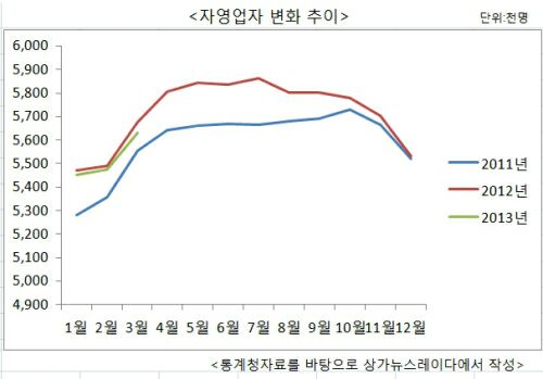7일 통계청과 상가정보업체 상가뉴스레이다에 따르면, 지난해 말부터 올 1월까지 지속적으로 감소하던 자영업자수가 올 2월을 기점으로 증가하고 있다. 올 3월 자영업자수는 563만1000명으로 지난해 12월 기준 553만2000명보다 9만9000명(약 18% 증가) 늘어났다.