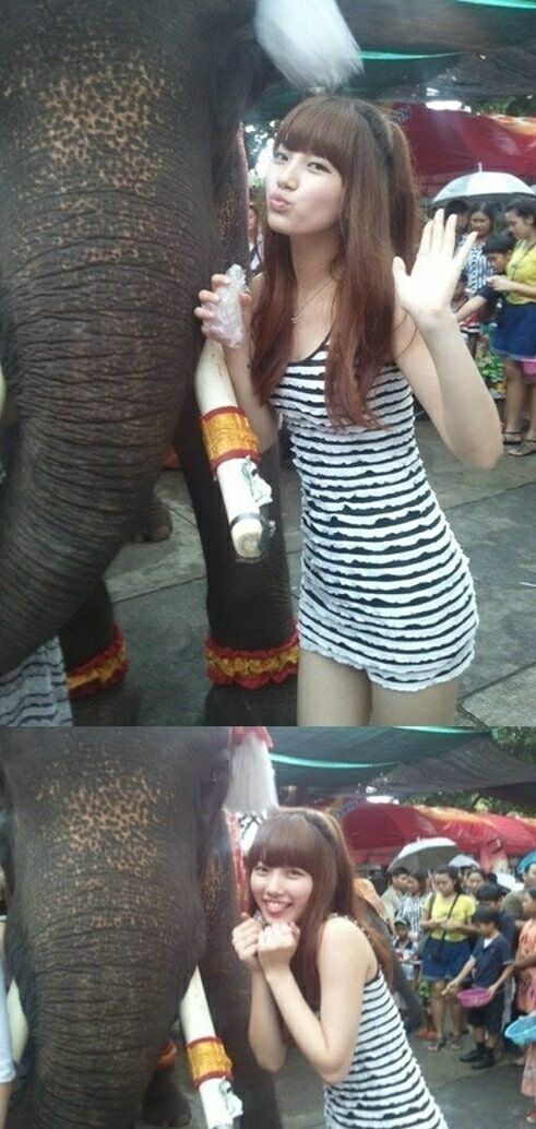 공개된 사진은 덩치 큰 코끼리 앞에 서 있는 수지의 모습을 담고 있다. 수지는 코끼리 옆에 서서 깜찍한 표정을 지으며 포즈를 취하고 있다. 특히 몸매가 드러나는 원피스를 입어 세련미를 과시하고 있다.