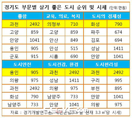 다음으로는 3.3㎡당 859만원의 고양시, 1041만원의 안양시가 뒤를 이어 ‘집값 상위지역=살기 좋은 도시’의 등식이 성립되는 것으로 나타났다. 각 분야별 1위 지역을 살펴보면 다음과 같다.