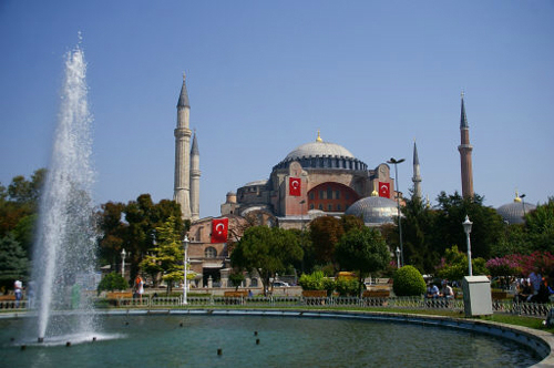 | 이스탄불의 최고 명물인 아야소피아성당. 서기 360년에 세워진 이 성당은 비잔틴 미술의 최고봉으로 꼽힌다. 성당 벽면의 빛 바랜 색과 주변의 푸르른 나무, 파란 하늘이 잘 어울린다. |