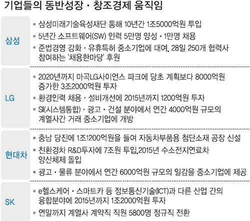 현대차는 4월 물류·광고 분야 일감 6000억원어치를 중소기업에 발주하거나 경쟁입찰에 부치겠다고 선언했다. 올해 물류 발주액의 45%, 광고 발주액의 65%에 해당하는 파격적인 규모였다. SK는 최근 정보통신기술(ICT)과 타 산업을 결합한 ‘융합산업’에 1조2000억원을 투자하겠다고 발표한 만큼 일단 이 사업의 이행에 충실하겠다는 입장이다.