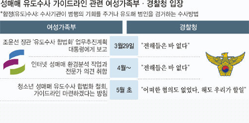 경찰 측은 수사권 침해라며 황당하다는 입장이다. 수사기관이 아닌 곳에서 수사기법을 마련한다는 것 자체가 어불성설인 데다 유도수사에 대한 법적 근거없이 함정수사를 할 수 없다고 주장한다. 게다가 여성부는 이 같은 가이드라인을 마련하면서 경찰과 협의조차 하지 않은 것으로 알려졌다.