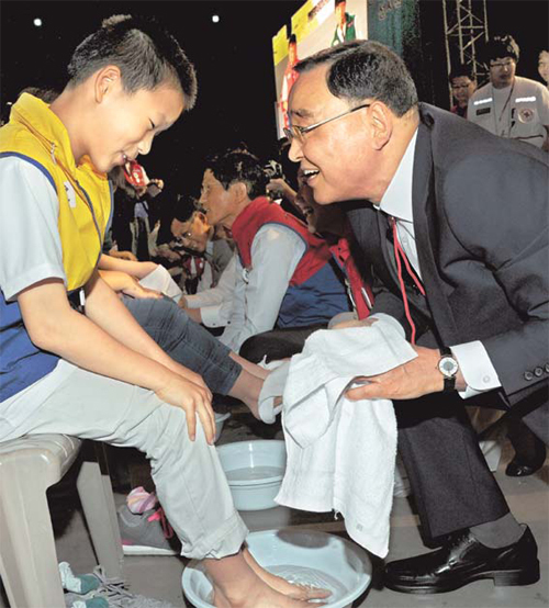 어린이 발 씻겨주는 정 총리 입력 : 2013-05-26 21:33:20 수정 : 2013-05-26 21:33:20 구글 네이버 유튜브 정홍원 국무총리가 25일 경기 고양시 킨텍스에서 열린 청소년적십자사(RCY) 창립 60주년 기념식의 ‘눈 맞추며 나누는 사랑의 대화’ 프로그램에 참여해 어린이의 발을 닦아주고 있다. <연합>연합> Copyright ⓒ 세계일보. 무단 전재 및 재배포 금지 연합