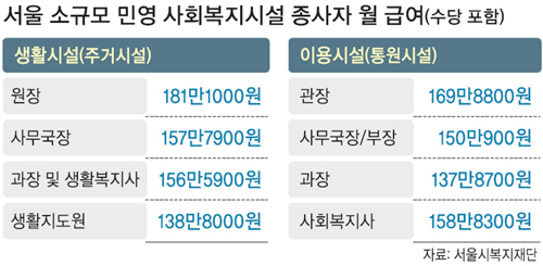 이 같은 급여는 2011년 통계청이 발표한 보건업 및 사회복지사업 종사자 임금 수준인 238만5800원보다 훨씬 낮은 수준이다. 이들 시설은 정부나 지방자치단체의 지원을 받는 법인시설과 달리 공공지원금을 거의 받지 않는다.