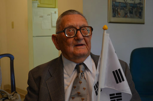 | 에드워드 로니 장군이 26일(현지시간) 워싱턴 서북쪽 외곽 ‘놀우드’ 군은퇴자커뮤니티에서 세계일보가 선물한 태극기를 앞에 두고 인터뷰하고 있다. 그는 인터뷰 내내 6·25전쟁 참전 장교로서 자부심과 한국에 대한 각별한 애정을 표시했다. 워싱턴=박희준 특파원 |
