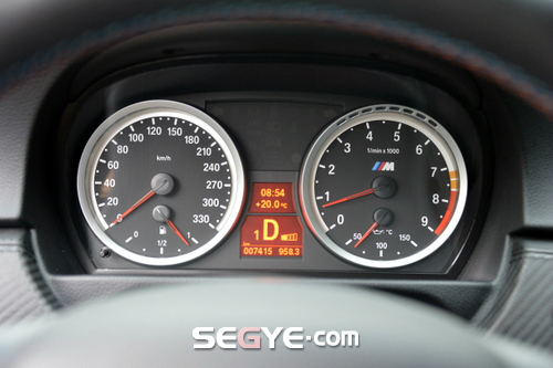 운전석에 앉아 시동을 걸었다. 구형 3시리즈를 기반으로 해서 아직도 키를 꼽아야 한다. 센터페시아를 비롯한 대부분의 실내는 구형 3시리즈와 동일하다. 변속기는 독일 게트락의 7단 듀얼클러치를 사용한다. M3를 위해 특별히 제작한 변속기다. BMW에서도 동일한 변속기를 쓰는 차가 없다. 일반적인 BMW 변속기와 작동법이 다르다. 주차(P) 모드는 없다. 시동을 끄면 자동으로 주차모드가 된다. 몸쪽 위로 당겨 올리면 후진(R)이 되고 오른쪽으로 밀면 주행(D) 모드다. 나머지는 위로 아래로 밀면서 변속을 한다. 스티어링휠에도 패들쉬프트가 달려서 주행중에 변속을 위해 사용할 일은 거의 없다.