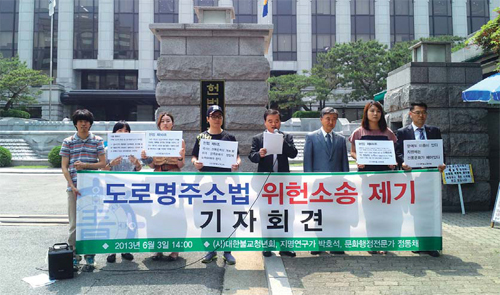대한불교청년회 회원과 정동채 전 문화부 장관, 지명연구가 박호석씨 등 63명은 3일 “오랫동안 써 온 법정지명에는 단순한 위치 표시 말고도 역사와 전통문화가 녹아 있다”며 “이를 없애는 새 도로명주소법은 전통문화의 정체성을 파괴하는 것”이라고 헌법소원 배경을 밝혔다.