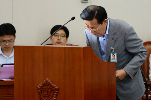 | 김균섭 한국수력원자력 사장(오른쪽)이 5일 오후 국회 산업통상자원위 전체회의에 출석해 원전 비리 사태와 관련한 현안보고를 마치고 인사하고 있다. 남정탁 기자 |