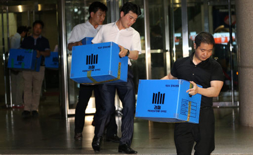 | 원전 부품 비리 사건을 수사 중인 부산지검 동부지청 원전비리 수사단이 5일 경기도 용인의 한국전력기술 사무실을 압수수색한 후 압수품을 옮기고 있다. 연합뉴스 |