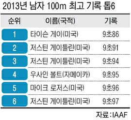 게이틀린은 2004년 아테네올림픽에서 이 종목 금메달리스트로 한때 ‘인간 탄환’으로 불렸다. 하지만 약물 복용이 들통 나 4년간 출전정지 처분을 받고 2010년에서야 트랙에 복귀했다. 게이틀린은 올 시즌 꾸준한 상승세를 보이고 있다. 그는 지난해 런던올림픽 100m에서 동메달을 목에 걸었다.