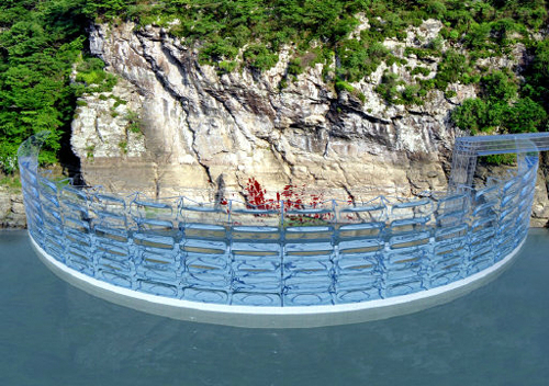 | 카이네틱댐 전경 가상도 정부는 수위 변화에 따라 높이 조절이 가능한 고강도 투명막으로 된 카이네틱댐을 반구대 암각화에 설치키로 했다고 16일 발표했다. 사진은 만수위 때의 댐 전경 가상도. 국무총리실 제공 |