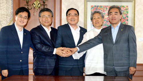 | 정홍원 국무총리 등 정부 관계자들이 16일 정부서울청사에서 반구대 암각화 보존을 위한 업무협약(MOU)을 체결한 뒤 기념촬영하고 있다. 왼쪽부터 김동연 총리실 국무조정실장, 박맹우 울산시장, 정 총리, 변영섭 문화재청장, 유진룡 문화체육관광부 장관. 이제원 기자 |