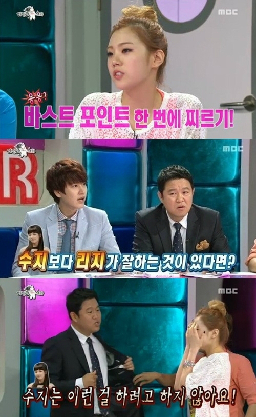 리지는 지난 19일 방송된 MBC 예능프로그램 ‘황금어장-라디오스타’(이하 라디오스타)에 같은 그룹 멤버 나나, 아나운서 출신 배우 최송현, 개그맨 출신 배우 김진수 등과 함께 출연했다. 이날 리지는 ‘라디오스타’ MC 규현으로부터 “‘대세’ 수지보다 잘할 수 있는 것이 있느냐”는 질문을 받았다.