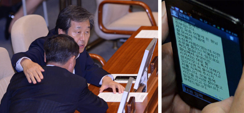 | “억울합니다” “괜찮아” ‘북방한계선(NLL) 회의록 대선 이전 입수 발언’의 당자인 새누리당 김무성 의원이 27일 국회 본회의장에서 발언 발설자로 지목된 김재원 의원의 등을 두드리며 이야기하고 있다. 오른쪽 사진은 김재원 의원이 김무성 의원을 찾아가기 전에 보낸 해명문자. 허정호 기자, 연합뉴스 |
