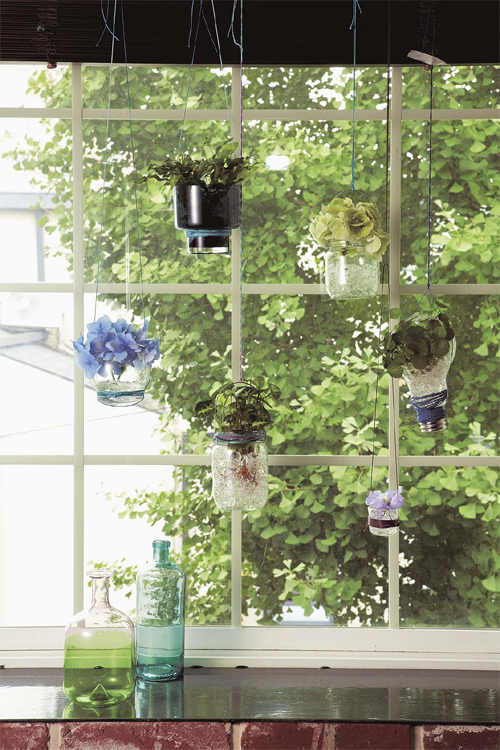 수경 재배는 인테리어로도 효과 만점이다. 화분처럼 배수구가 필요 없어 얼마든지 다양한 용기에 담아 디자인 소품으로 활용할 수 있다. 유리로 된 용기를 색색의 끈으로 감아 걸면 청량감 넘치는 장식품이 된다. 용기는 음료수 병이나 각종 소스통 등 생활 용품을 재활용할 수 있다. 물속에 ‘워터 젤리’를 넣으면 시원해 보이는 여름철 장식용품이 완성된다. ‘워터 젤리’는 동네 꽃집이나 꽃시장에서 판매한다.