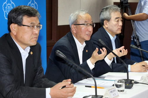 | 현오석 경제부총리 겸 기획재정부 장관(가운데)과 최문기 미래창조과학부 장관(왼쪽), 유진룡 문화체육관광부 장관(오른쪽)이 4일 서울 여의도 수출입은행에서 서비스업의 세제·금융지원, 제도 운용상 차별 철폐 등의 내용이 담긴 ‘서비스산업 정책 추진방향 및 1단계 대책’을 발표하고 있다. 연합뉴스 |
