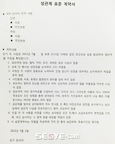 이는 “남녀 계약 당사자 합의하에 성관계를 가졌으며 서로 민·형사상 책임을 지지 않는다”는 내용이 명기된 이른바 ‘성관계 표준 계약서’다.