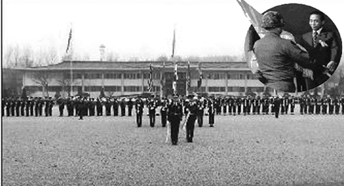 | 한미연합군사령부 창설 기념식이 1978년 11월7일 서울 용산 주한미군 기지에서 거행되고 있다. 원안의 작은 사진은 박정희 대통령이 부대 깃발을 전달하는 장면. 국방부 군사편찬연구소 제공 |