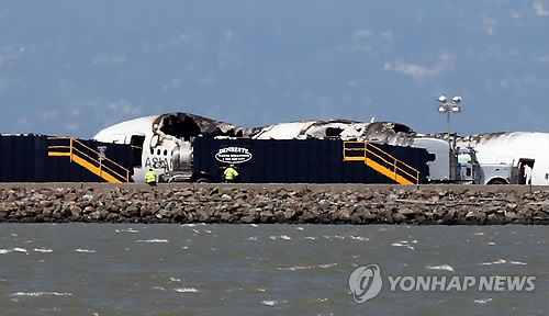 | 지난 9일 샌프란시스코공항 활주로 근처에 그대로 보전되고 있는 기체 근처에서 관계자들이 분주하게 움직이고 있다. |