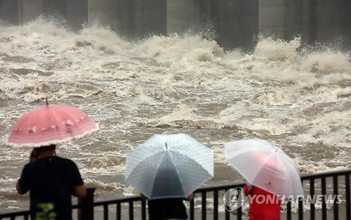 | 경기도 연천군 군남면 군남홍수조절지에서 지난 12일 주민들이 물이 하류로 쏟아지는 모습을 바라보고 있다. |
