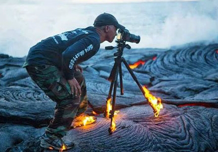 하와이를 무대로 활동 중인 카위카 싱슨은 최근 SNS에 자신의 사진을 공개했다. 사진 속 그의 발과 카메라 삼각대에는 불이 옮겨붙어 있다. 싱슨은 용암 열기에도 아랑곳하지 않고 촬영에 매진했다.