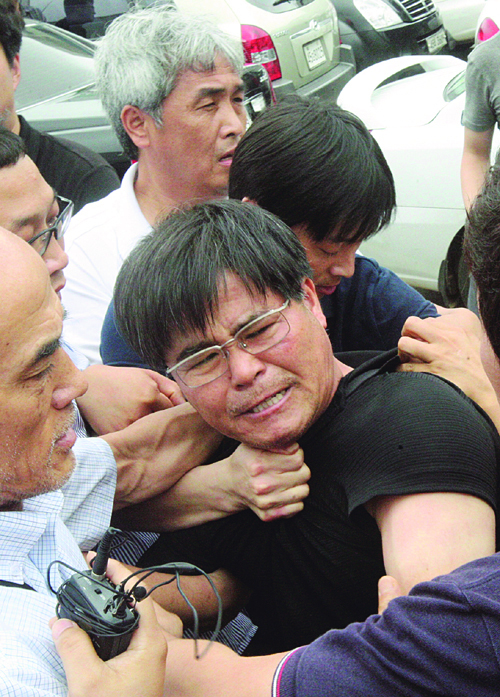 | 고교생 5명이 숨진 충남 태안군 안면도‘사설 해병대 캠프 사고’와 관련해 이상규 공주사대부고 교장이 21일 학생들의 빈소가 마련된 태안보건의료원에서 사퇴 의사를 밝히자 유가족들이 거칠게 항의하고 있다. 태안=연합뉴스 |