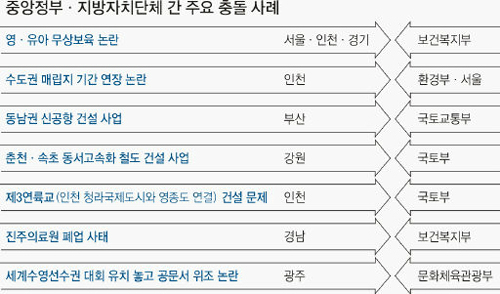 중앙정부와 지자체 간 대결 원인은 다양하다. 예산 배분이나 정책의 차이에서 빚어지는 갈등이 많다. 무상보육 논란도 마찬가지다. 이 문제는 내년 지방선거에서 민심에 적잖은 영향을 미칠 수 있는 만큼 관련 지자체장의 행보는 갈수록 공세적이다.