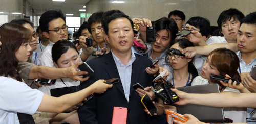 | 답변하는 기록원장 박경국 국가기록원장(가운데)이 22일 국회 운영위 전체회의가 비공개로 전환된 직후 회의장 밖으로 나와 취재진의 질문에 답변하고 있다. 연합뉴스 |