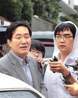 | 전두환 전 대통령 부부의 변호인인 정주교 변호사가 23일 서울 연희동 전 전 대통령 자택 방문을 마친 뒤 취재진의 질문에 답하고 있다. 연합뉴스 |
