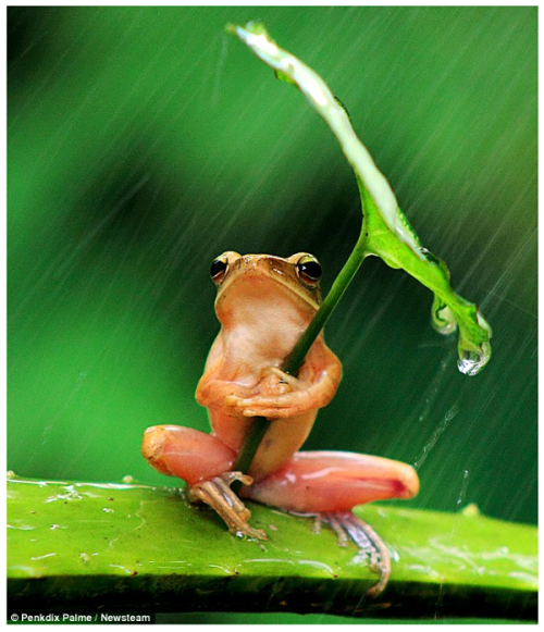 공개된 사진에는 나뭇잎 위에 앉은 개구리 한 마리의 모습이 담겨 있다. 이 사진은 해외의 사진작가 펜크딕스 팔메(27)가 인도네시아에서 찍었으며, 개구리는 무려 30분 동안이나 비바람을 피하려고 이리저리 나뭇잎을 돌린 것으로 알려졌다. 특히 개구리는 나뭇잎을 비 오는 방향으로 기울이는 등 머리를 써 웃음을 자아낸다.