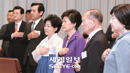 | 박근혜 대통령이 25일 오전 청와대에서 열린 문화융성위원회 제1차 회의에서 참석자와 함께 국기에 대한 경례를 하고 있다. 이제원 기자 |
