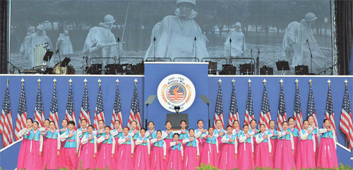 | 리틀엔젤스 예술단이 27일 워싱턴 6·25전쟁 참전 기념공원 옆에서 열린 정전 60주년 기념식에서 ‘아리랑’ 등을 합창하는 식전공연을 하고 있다. 워싱턴=박희준 특파원 |