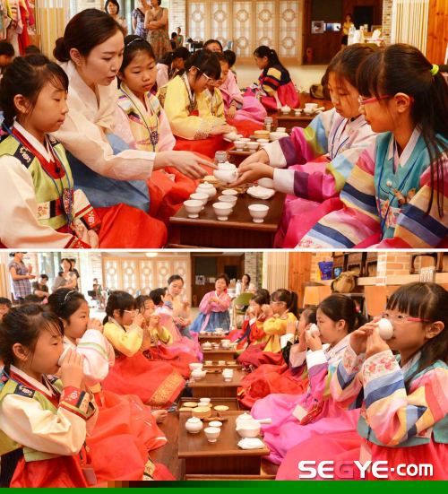 여름방학을 맞은 초등학생들이 29일 오전 서울 강동구 암사동 선사유적지 전시실에서 한복을 입고 다도 체험을 하고 있다. 이번 전통 예절 체험은 입시와 성적에 치우친 학교교육을 보완하고 학생들의 정서 함양을 위해 기획됐다.