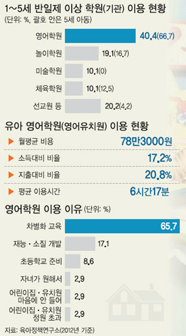 서울 강남에서 유치원 원장을 했던 안순아씨는 “엄마들이 방과후수업은 신뢰하지 않는 데다 1주일에 한두 번 하는 것으로 만족하지 않기 때문에 영어를 정규수업으로 편성하고 20만원 안팎의 수업료를 따로 걷는 곳이 많다”고 귀띔했다.