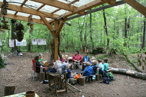 | 레벤스가르텐 마을 어린이와 교사들이 마을과 연결된 숲 속에 조성된 ‘숲 유치원’에서 식사를 하고 있다. |
