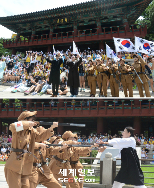 [포토] 보신각에서 립덥뮤지컬UCC 촬영 입력 : 2013-08-15 21:36:26 수정 : 2013-08-15 21:36:26 구글 네이버 유튜브 광복절을 맞은 15일 오후 서울 종로 보신각에서 자발적으로 참석한 시민들과 퍼포먼스 전문가들이 광복절 기념 ‘립덥뮤지컬UCC’ 촬영을 하고 있다. 립덥뮤지컬UCC는 유관순, 안중근 등 독립운동가들의 행적 퍼포먼스를 통해 일제치하에서 광복이 되기까지의 과정을 표현한다. 립덥은 립싱크와 더빙의 합성어다.김범준기자 bjkim@segye.com Copyright ⓒ 세계일보. 무단 전재 및 재배포 금지 세계일보 김범준