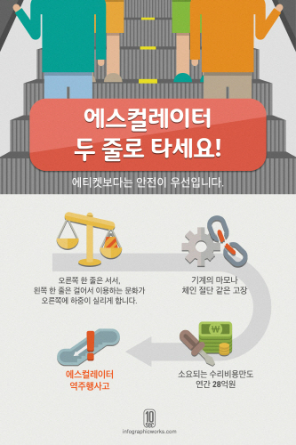 현재 에스컬레이터는 오른쪽 한 줄은 서서 가고, 왼쪽 한 줄은 걸어서 이용하는 문화가 형성돼 있다. 이렇다 보니 오른쪽에 하중이 실리면서 기계의 마모나 체인 절단 같은 고장이 발생하고 있다. 이 때문에 소요되는 수리비용만도 연간 28억원에 달한다. 에스컬레이터로 걷는 이용객이 넘어지는 바람에 다른 이용객까지 다치는 사고도 생긴다.
